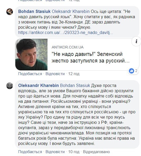 Один из членов команды кандидата в президенты Владимира Зеленского Александр Харебин заявил, что Украина имеет собственные права на русский язык. Он считает, что разделять страну на украино- и русскоговорящих – это тезисы, которые использует страна-оккупант. Об этом Харебин написал в комментариях под своим постом в соцсети Facebook.