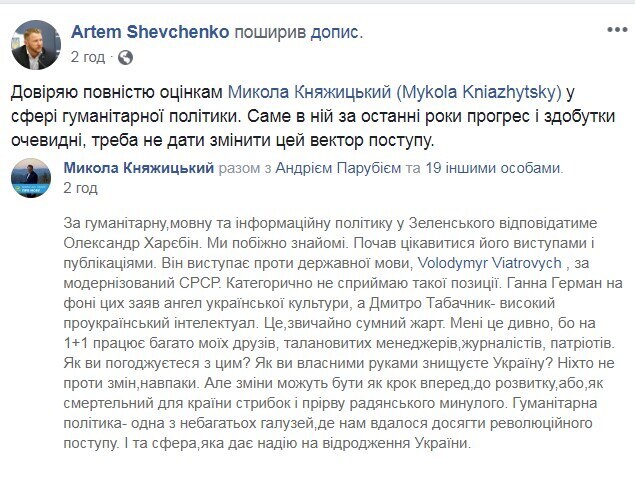 "За языковую и информационную политику у Зеленского будет отвечать Александр Харебин. Мы немного знакомы. Начал интересоваться его выступлениями и публикациями. Он выступает против государственного языка и за модернизированный СССР", – написал Княжицкий на своей странице в Facebook.