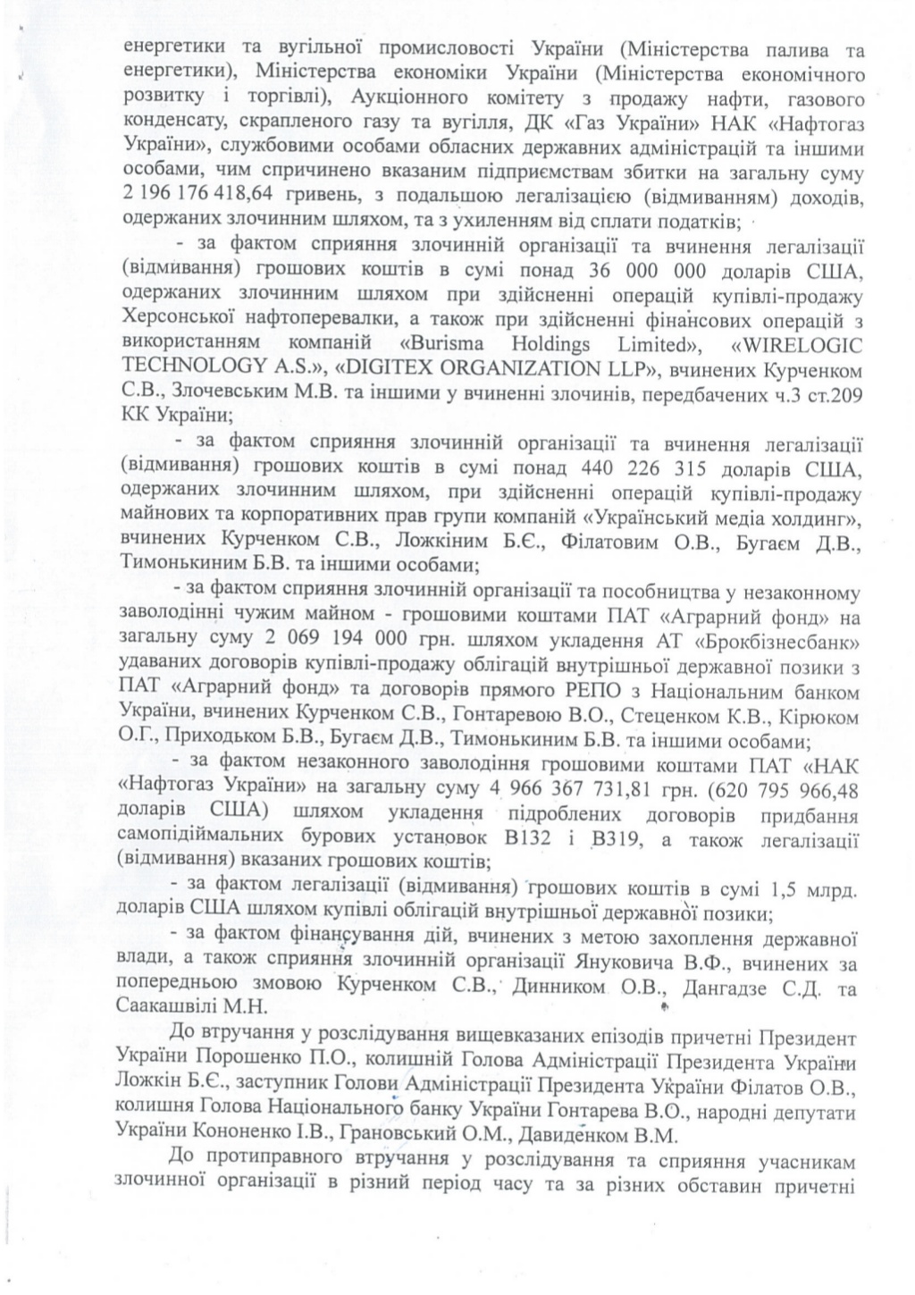 В рапорте напоминается о завершении расследования в ряде уголовных производств по признакам состава преступлений, предусмотренных ч.1 ст. 255, ч. 5 ст. 191 ч. 1 ст. 366, ч. 3 ст.358, ч. 3 ст.209, ч. 3 ст. 212, ч.2 ст. 205 Уголовного кодекса Украины по фактам совершения участниками преступной организации экс-президента Украины Виктора Януковича преступлений экономической направленности, легализации (отмывания) имущества, полученного преступным путем.