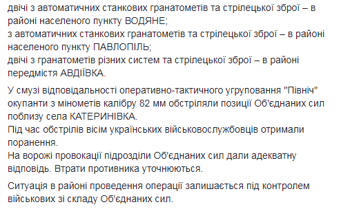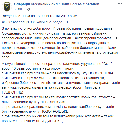 Зафиксировано применение вооружения, запрещенного Минскими договоренностями. Также НВФ вели огонь по позициям подразделений ООС из противотанковых ракетных комплексов (ПТРК), боевых машин пехоты, гранатометов различных систем, крупнокалиберных пулеметов и стрелкового оружия.