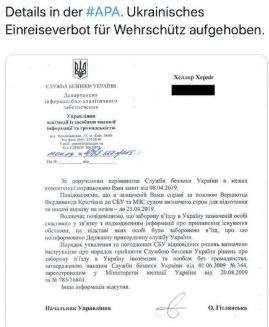 В письме от СБУ, подписанном пресс-секретарем Еленой Гитлянской, говорится о снятии запрета "в связи с поступлением информации о прекращении существования обстоятельств, на основании которых лицу был запрещен въезд".