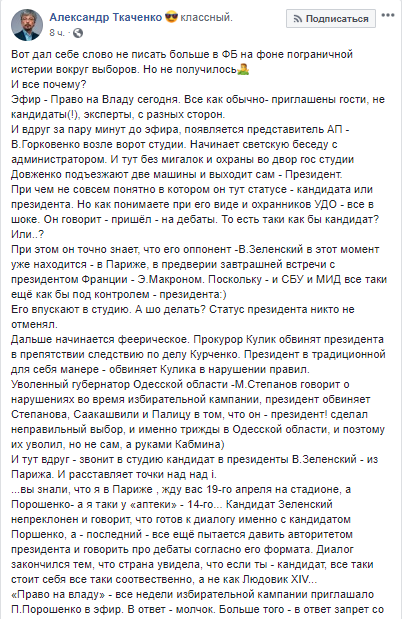 Дальше начинается феерическое. Прокурор Кулик обвинят президента в препятствии следствию по делу Курченко. Президент в традиционной для себя манере - обвиняет Кулика в нарушении правил. Уволенный губернатор Одесской области - Степанов говорит о нарушениях во время избирательной кампании, президент обвиняет Степанова, Саакашвили и Палицу в том, что он - президент - сделал неправильный выбор, и именно трижды в Одесской области, и поэтому их уволил, но не сам, а руками Кабмина. И тут вдруг звонит в студию в президенты Зеленский - из Парижа. И расставляет точки над над і", - написал Ткаченко.