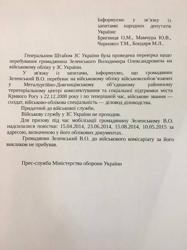"Гражданин Зеленский В.А. находится на воинском учете военнообязанных в Металлургическо-Долгинцевском объединенном районном территориальном центре комплектования и социальной поддержки Кривого Рога с 22.12.2008 года и по настоящее время, воинское звание - солдат, военно-учетная специальность - делопроизводитель делопроизводства. Годен к военной службе. Военную службу в ВС Украины не проходил", - говорится в сообщении.