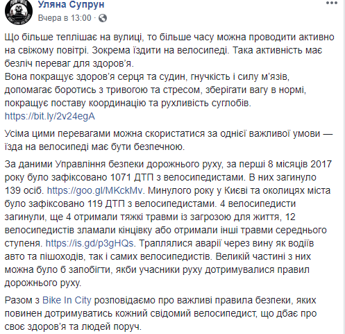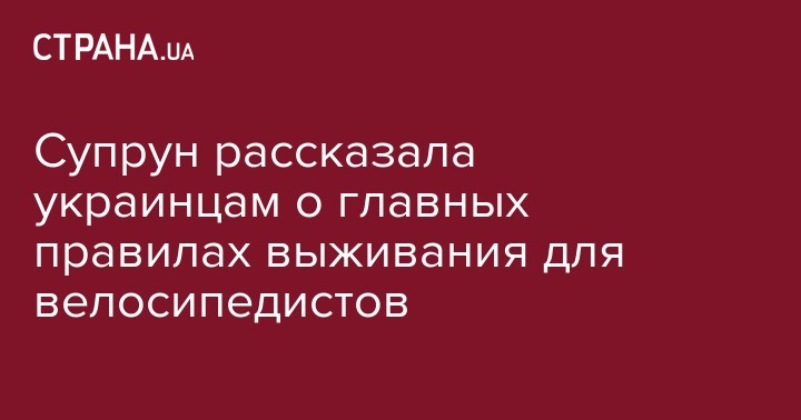 Глава Минздрава Ульяна Супрун рассказала украинцам о важных правилах, которые должен соблюдать каждый сознательный велосипедист, чтобы быть здоровым и заботиться о здоровье окружающих. Правила, составленные при помощи сообщества Bike In City, Супрун опубликовала на своей странице в Facebook.
