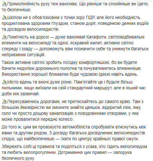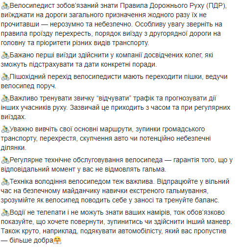 Супрун сообщила, что велосипедист обязан знать правила дорожного движения, особое внимание следует уделить правилам проезда перекрестков, порядку выезда со второстепенной дороги на главную и приоритетам разных видов транспорта. Первые выезды на оживленные трассы желательно осуществить в компании опытных коллег, которые могут подстраховать и дать конкретные советы.