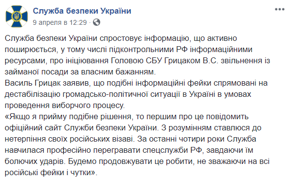 9 апреля Службе безопасности Украины пришлось опровергать информацию об отставке своего начальника - Василия Грицака.