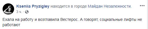 "Ехала на работу и возглавила Вестерос. А говорят, социальные лифты не работают", - говорится в сообщении. Она также опубликовала фото ходоков. Персонажей сериала можно было увидеть на станции "Майдан Незалежности". В руках одного из них была золотая корона, которую он надел на киевлянку, а второй держал флаг.