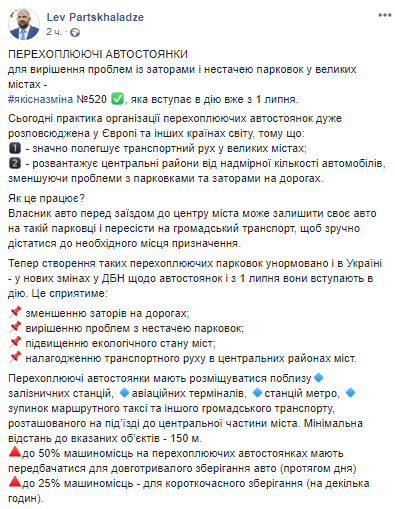 "Для решения проблем с пробками и нехваткой парковок в больших городах -#Качественноеизменение №520, которое вступает в действие уже с 1 июля", - отметил Парцхаладзе.