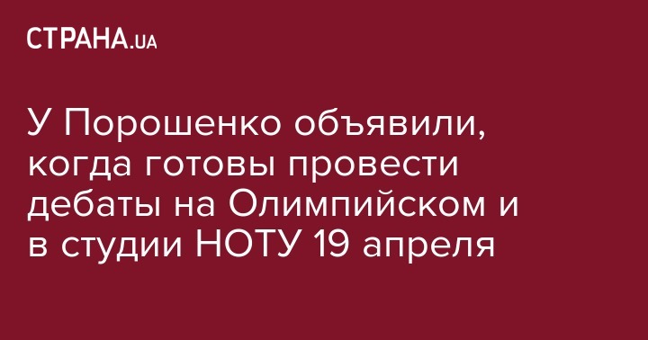 Ранее спикер штаба Зеленского Дмитрий Разумков заявил, что кандидат в президенты Украины Зеленский ждет действующего президента Порошенко на предвыборные дебаты 19 апреля на НСК "Олимпийский", а в воскресенье, 14 апреля, под стадионом проходил агитационный митинг Порошенко.