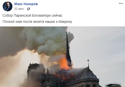 "Собор Парижской Богоматери сейчас. Плохой знак после визита наших к Макрону", – написал журналист Макс Назаров.