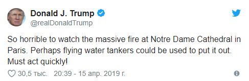 Пожар прокомментировал президент США Дональд Трамп. Он предложил сбрасывать на горящее здание воду при помощи авиации.