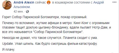 Update. Упал шпиль. Как будто смотришь фильм-катастрофу. Я плачу", – пишет блогер Андрей Алексин.