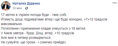 Но уже в четверг, 18 апреля, развиднеется. Не унывайте, еще немного - и солнышко придет", - написала Наталья Диденко.
