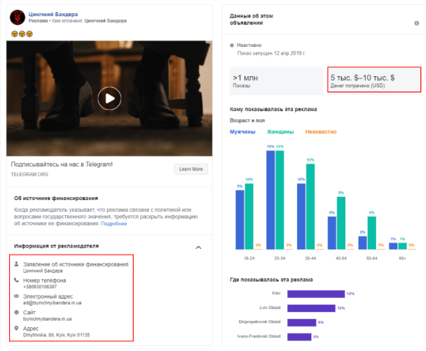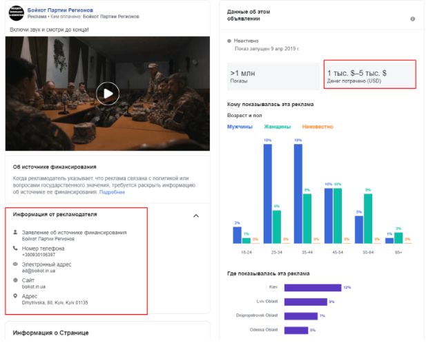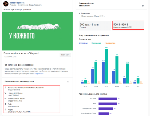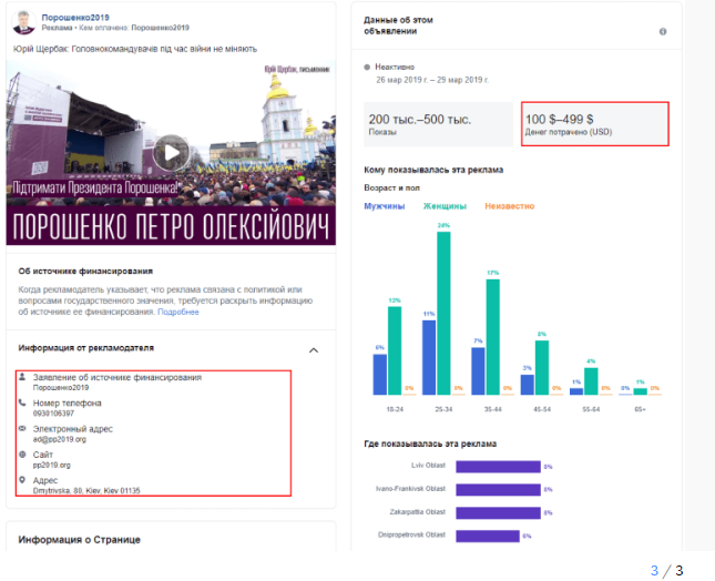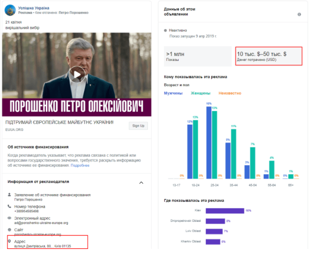 Благодаря тому, что Facebook раскрыл данные о заказчиках политической рекламы в соцсети, журналисту Евгению Спирину удалось узнать, что рекламные аккаунты, с которых запускалось продвижение на официальной странице Порошенко и в пабликах, публикующих антирекламу Владимира Зеленского и других соперников президента в первом туре, привязаны к одному и тому же номеру телефона. Он принадлежит сотруднице украинского цифрового агентства Postmen.