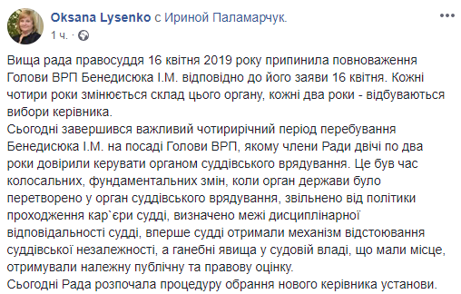 "Сегодня завершился важный четырехлетний период пребывания Бенедисюка на должности председателя ВСП, которому члены совета дважды доверили руководить органом судейского управления. Это было время колоссальных, фундаментальных изменений, когда орган был преобразован в орган судейского управления, а позорные явления в судебной власти, имевшие место, получали надлежащую публичную и правовую оценку", - отметила она.