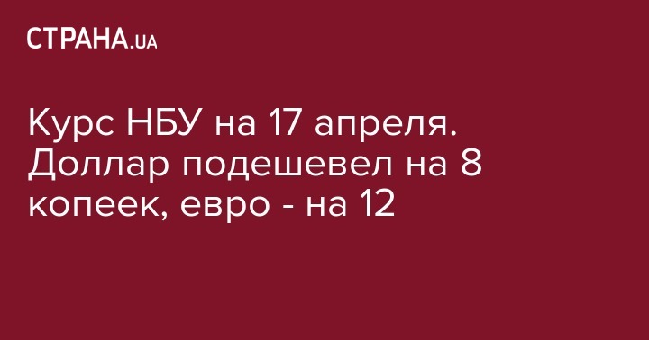 Национальный банк Украины (НБУ) установил курс основных валют по отношению к гривне на среду, 17 апреля. По сравнению с предыдущим банковским днем, курс доллара понизился на 8 копеек. Об этом говорится на официальном сайте НБУ.