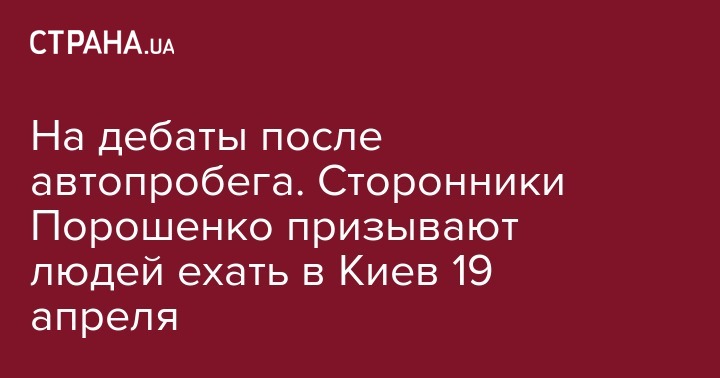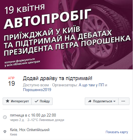 Мероприятие называется "Добавь драйва и поддержи!", его организатором является не официальная страница Порошенко, а паблики "А что там у ПП" и "Порошенко2019". Сообщается, что автопробег состоится в поддержку действующего президента, а автоколонны, сформированные во всех областных центрах, будут направляться на дебаты в Киев. Событие, судя по опубликованной информации, должно пройти 19 апреля с 16:00 до 22:00.