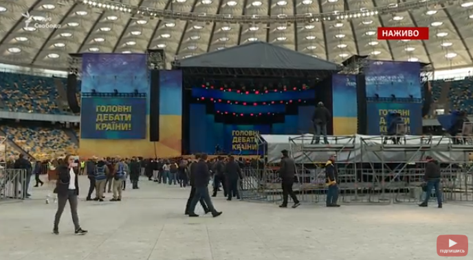 19 апреля. В 19:00 на стадионе должны начаться дебаты с участием двух кандидатов. Они арендовали стадион на целый день. После НСК "Олимпийский" Порошенко намерен поехать еще и на телеканал "UA:Суспільне", чтобы провести дебаты "в нормальных студийных условиях, более пригодных для содержательной дискуссии". Владимир Зеленский не выразил желания участвовать в еще одних дебатах за вечер. При этом Порошенко говорят, что официальными дебатами нужно считать выступление в телестудии, у Зеленского - что на стадионе.