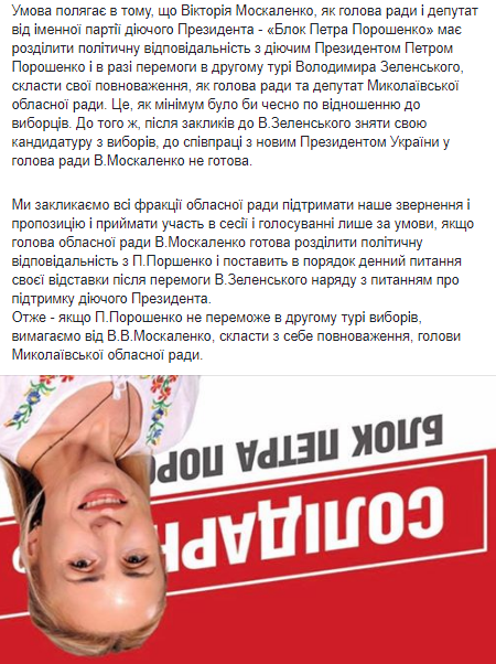 Также он добавил, что фракция "Батькивщина", лидером местной организации которой он является, готова принять участие "во внеочередной сессии, хотя и собирается она по политическим мотивам и по инструкции из Администрации президента" при условии, что Виктория Москаленко, как председатель совета и депутат от именной партии действующего президента БПП сложит полномочия в случае победы Зеленского во втором туре выборов.