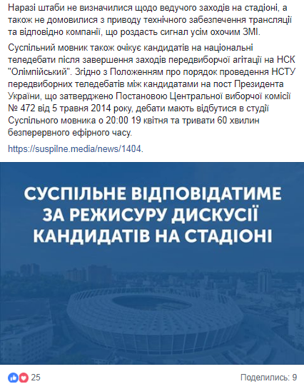 Зураб Аласания на своей странице в соцсети Facebook также сообщил, что вскоре ожидается решение ЦИК относительно изменения времени национальных дебатов с 20:00 до 21:00 (как сейчас) на один час позже, то есть с 21:00 до 22:00. Это необходимо, чтобы Порошенко с Зеленским могли после мероприятия на стадионе проехать в студию Общественного и поучаствовать в теледебатах, как это предусмотрено в законодательстве.