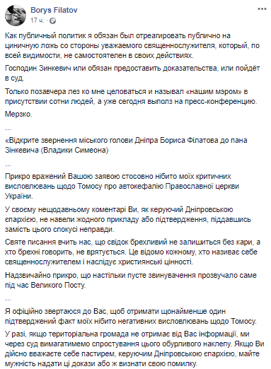 Только позавчера лез ко мне целоваться и называл "нашим мэром" в присутствии сотни людей, а уже сегодня выполз на пресс-конференцию. Мерзко", написал мэр Днепра на своей стрнице в соцсети и опубликовал открытое обращение к священнослужителю.