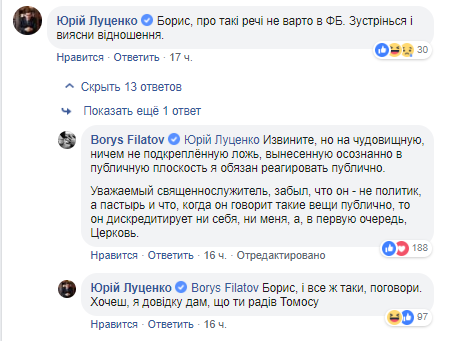 Любопытно, что мимо поста Бориса Филатова не смог пройти генпрокурор Юрий Луценко, который в комментариях порекомендовал мэру Днепра не обсуждать этот вопрос публично, а встретиться с епископом и выяснить отношения.