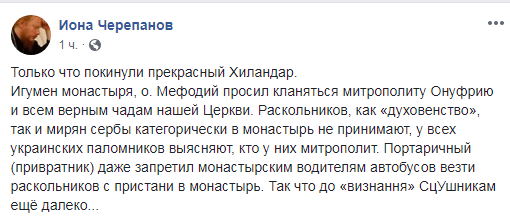 "Игумен монастыря, о. Мефодий просил кланяться митрополиту Онуфрию и всем верным чадам нашей Церкви. Раскольников, как "духовенство", так и мирян (членов ПЦУ - прим. ред) сербы категорически в монастырь не принимают, у всех украинских паломников выясняют, кто у них митрополит. Портаричный (привратник) даже запретил монастырским водителям автобусов везти раскольников с пристани в монастырь. Так что до "визнання" СцУшникам (признания членов ПЦУ - прим. ред.) ещё далеко..." - говорится в опубликованном сообщении.