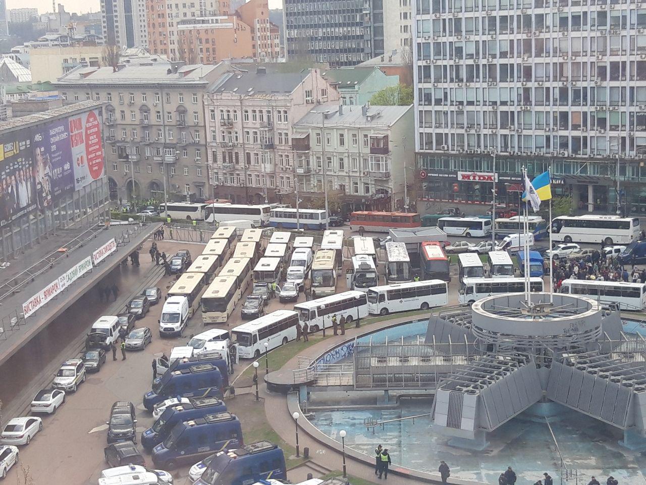 Сторонники действующего президента Петра Порошенко после участия в его агитационном мероприятии на Майдане Независимости колонной направились в сторону НСК "Олимпийский", где вечером пройдут дебаты кандидатов в президенты. Также людей на стадион везут на автобусах и отмечают их в списках.