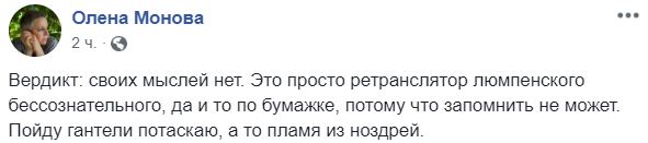"Вердикт: своих мыслей нет. Это просто ретранслятор люмпенского бессознательного, да и то по бумажке, потому что запомнить не может", - пишет в Facebook Елена Монова.