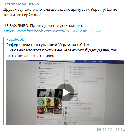 В субботу, 20 апреля, в день тишины перед вторым туром выборов, когда в Украине по закону запрещена любая агитация, на официальном Telegram-канале Петра Порошенко появилась ссылка на видео. На нем заснят пост Елены Зеленской на Facebook о том, что она якобы собирает данные о передвижении украинской армии