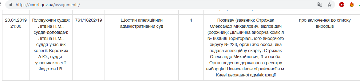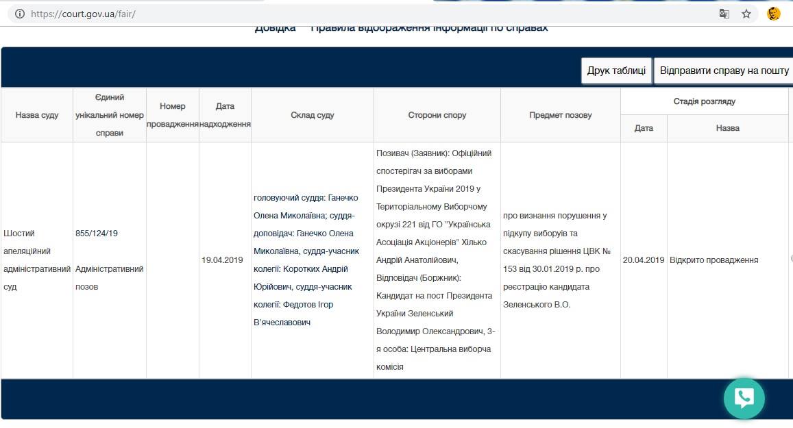 В соответствии с информацией на сайте Судебной власти Украины, дело №855/124/19 о признании нарушений в подкупе избирателей и отмене решения ЦИК № 153 от 30.01.2019 г. о регистрации кандидата Зеленского В.А. действительно будет рассматриваться сегодня, 20 апреля в Шестом апелляционном суде.