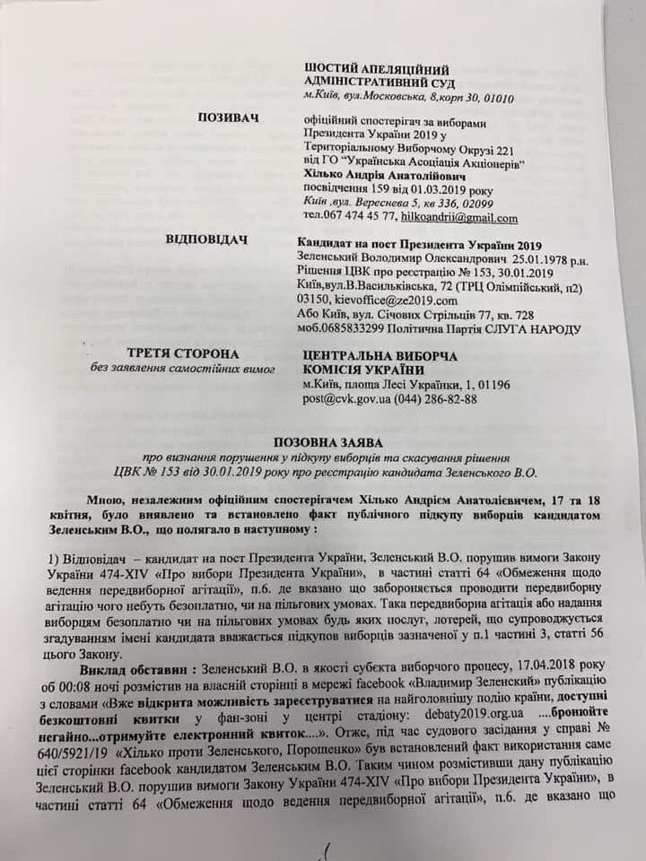 В субботу, 20 апреля Шестой апелляционный суд Киева должен быть начать в 21.00 рассмотрение дела о возможном аннулировании регистрации Владимира Зеленского кандидатом в президенты по иску адвоката Андрея Хилько.
