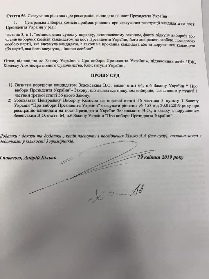 Он обвиняет команду Зеленского в подкупе избирателей - бесплатной раздаче билетов на "Олимпийский". И требует отменить решение Центральной избирательной комиссии Украины о регистрации Зеленского кандидатом в президенты.