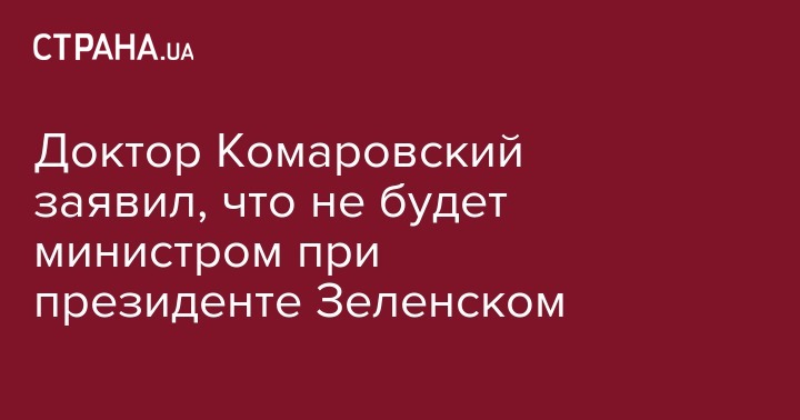 Член команды кандидата в президенты Владимира Зеленского, педиатр Евгений Комаровский, заявил, что не планирует быть министром здравоохранения в случае победы шоумена на выборах. Об этом врач сообщил в Facebook.