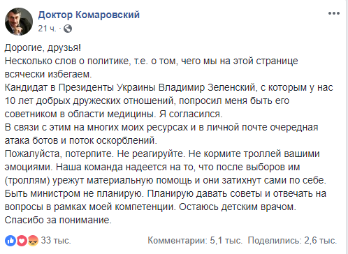 "Пожалуйста, потерпите. Не реагируйте. Не кормите троллей вашими эмоциями. Наша команда надеется на то, что после выборов им (троллям) урежут материальную помощь и они затихнут сами по себе. Быть министром не планирую. Планирую давать советы и отвечать на вопросы в рамках моей компетенции. Остаюсь детским врачом", - написал Комаровский в соцсети.