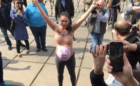 На участке Зеленского произошел небольшой инцидент. Туда пришла активистка Femen. Беременная женщина выкрикивала слоган: "Хватит насиловать страну!". Когда Зеленский зашел на участок, она сняла одежду и осталась в одних брюках. На животе у нее была нарисована морда кота, что отсылает к спичу Петра Порошенко на дебатах. который назвал Зеленского котом в мешке. Активистка отметила, что выступает против обоих кандидатов в президенты Украины. По предварительным данным, полиция не задержала представительницу Femen.