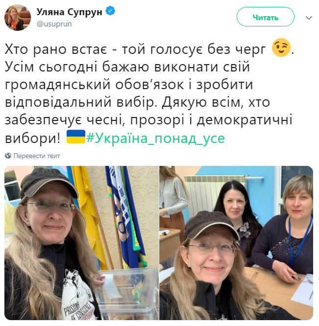 Ульяна Супрун после голосования обнародовала пост и фото в Twitter. Она написала, что рано встала, поэтому застала участок без очередей. Текст она сопроводила хэштегом "Украина превыше всего", который является калькой с немецкого Deutschland uber alles - гимна сначала Веймарской республики, а потом - Третьего рейха. После разгрома нацистов эта строчка из немецкого гимна была изъята.