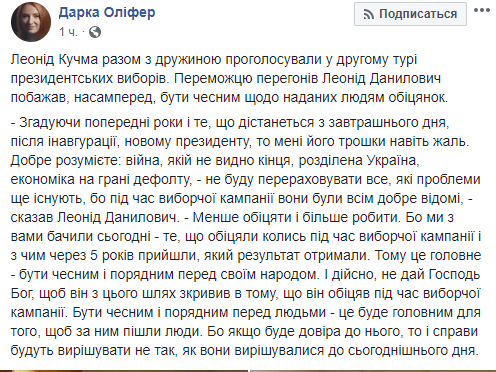 Также Кучма пожелал, чтобы будущий президент придерживался своих обещаний и не "свернул с пути".
