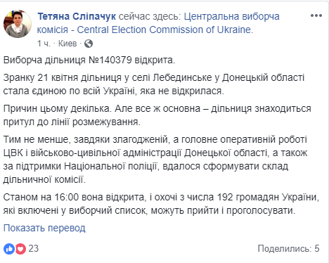 В ЦИК сообщили причину, по которой был закрыт избирательный участок. "Причин этому несколько. Но все же основная – участок находится вплотную к линии разграничения", - указала глава ЦИК Татьяна Слипачук на своей странице в Facebook. "Благодаря слаженной, а главное - оперативной работе ЦИК и военно-гражданской администрации Донецкой области, а также при поддержке Национальной полиции, удалось сформировать состав участковой комиссии. По состоянию на 16:00 она открыта, и желающие из числа 192 граждан Украины, которые включены в избирательный список, могут прийти и проголосовать", - написала Слипачук.