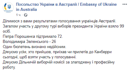 Отметим, что в первом туре выборов  явка украинцев в Австралии составила 7,2% - 125 человек из 1737 включенных в список. При этом Владимир Зеленский набрал 14 голосов, а Петр Порошенко - 69.