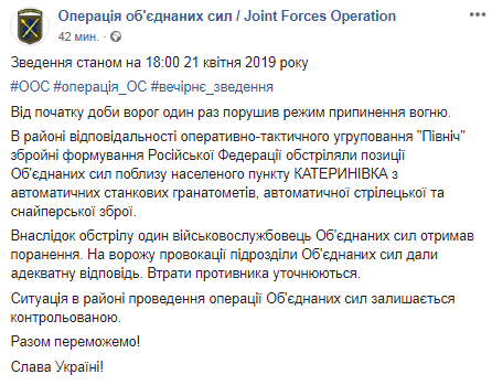 Так, по состоянию на 18:00 в районе ответственности оперативно-тактической группировки "Север" вооруженные формирования противника обстреляли позиции ООС вблизи населенного пункта Екатериновка.