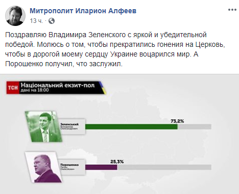 "Поздравляю Владимира Зеленского с яркой и убедительной победой. Молюсь о том, чтобы прекратились гонения на Церковь, чтобы в дорогой моему сердцу Украине воцарился мир. А Порошенко получил, что заслужил".