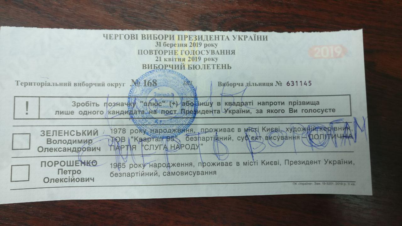 Отмечается, что избиратели на бюллетенях рисовали или выражали недовольство политикой. На одних украинцы дописывали графу "против всех", на других размашисто писали "Идите к черту" или просто черкали бюллетень. А на избирательном участке № 800635 в Подольском районе Киева один из бюллетеней был испачкан коричневым веществом.