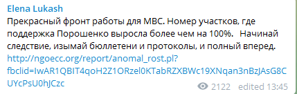 "Прекрасный фронт работы для МВС. Номер участков, где поддержка Порошенко выросла более чем на 100%. Начинай следствие, изымай бюллетени и протоколы, и полный вперед", - написала Елена Лукаш, прикрепив ссылку на данные ГО "Европейский координационный совет".
