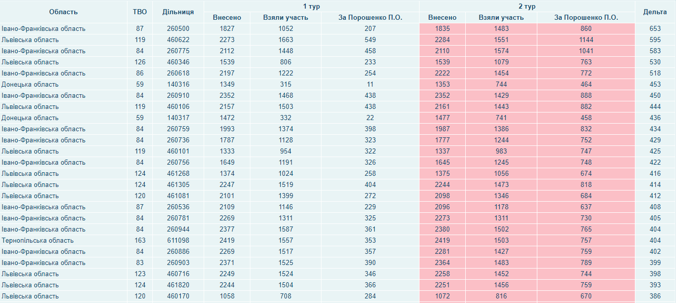 Так, организация приводит данные по областям с указанием участков, на которых поддержка Петра Порошенко во втором туре выросла более, чем на 100%. Большинство случаев такой активности относятся к участкам в Ивано-Франковской, Тернопольской и Львовской областях, где по предварительным данным лидирует Петр Порошенко.