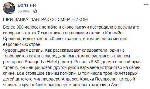 На Шри-Ланке трое детей датского миллиардера погибли от взрыва смертника, стоявшего в очереди за омлетом