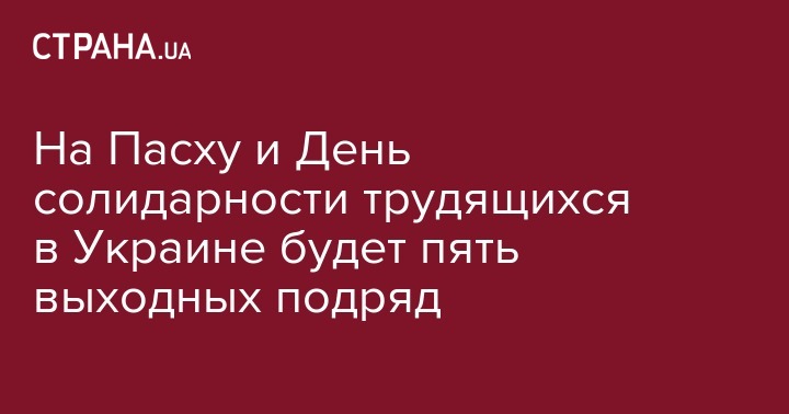 В Украине с Пасхи 28 апреля по четверг, 2 мая будут выходные дни. Таким образом работники будут отдыхать 5 дней подряд. Об этом говорится в распоряжении от 10 января 2019 года № 7-р "О переносе рабочих дней в 2019 году".