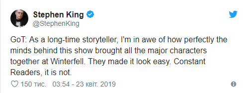 После выхода второй серии "Игре престолов" сделал комплимент знаменитый автор ужастиков Стивен Книг. В Twitter он написал, что, как автор, пишущий длительное время, находится в восторге от того, как прекрасно умы этого шоу собрали вместе всех главных героев в Винтерфелле. Причем сюжетно это выглядит легко, но читатели могут быть уверены, что сделать это на самом деле было непросто.