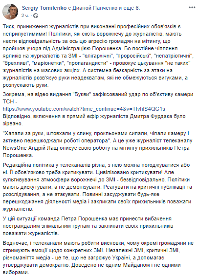 "Давление, унижение журналистов при исполнении профессиональных обязанностей недопустимы! Политики, которые сеют вражду к журналистам, должны нести ответственность за агрессию граждан на митинге, который прошел вчера под Администрацией Порошенко. Потому что постоянное цепляние ярлыков на журналистов и СМИ - "олигархические", "пророссийские", "непатриотичные", "лживые", "марионетки", "пропагандисты" - провоцирует травлю "не таких" журналистов на массовых акциях. А системная безнаказанность за атаки на журналистов развязывает руки неадекватам, которые не ограничиваются восклицаниями, а распускают руки", - написал на своей странице в соцсети глава Национального союза журналистов Украины Сергей Томиленко.