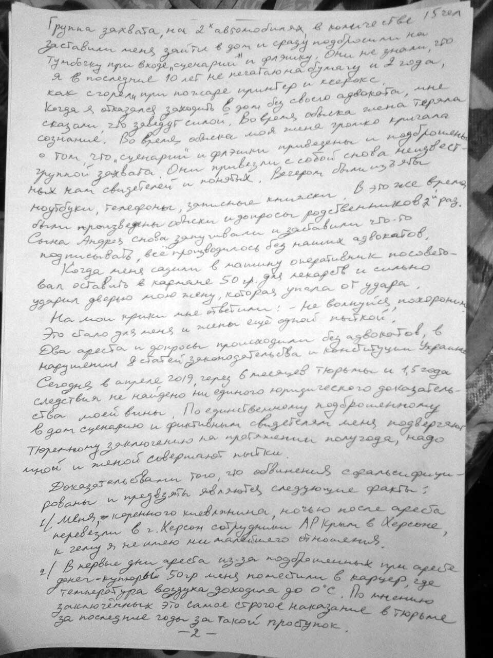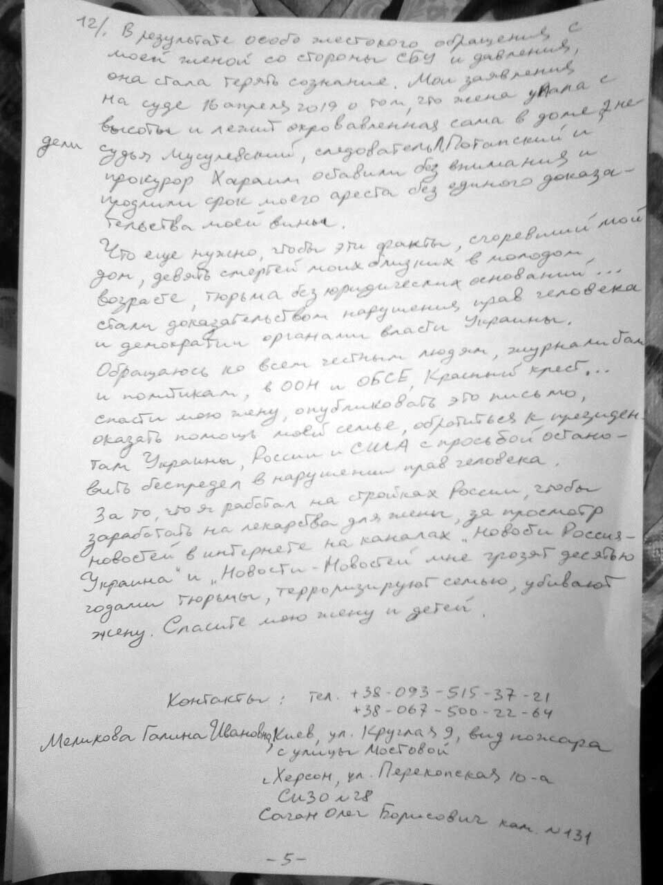 12. В результате особо жестокого обращения с моей женой со стороны СБУ и давления, она стала терять сознание. Мои заявления на суде 16 апреля 2019 г. упала и лежит окровавленная сама в доме, 2 недели, судья Мусумявский, следователь Л.Потанский, и прокурор Хараш, оставили без внимания и продлили срок моего ареста без единого доказательства моей вины. Что ещё нужно, чтобы эти факты – сгоревший мой дом, тюремное заключение без юридических оснований, стали доказательством нарушения прав человека и демократии органами власти Украины. Обращаюсь ко всем честным людям, журналистам и политикам, в ООН и ОБСЕ, Красный Крест, спасти мою жену, опубликовать это письмо, оказать помощь моей семье, обратиться к президентам Украины, России и США с просьбой остановить беспредел в нарушении прав человека. За то, что я работал на стройках России, чтобы заработать на лекарства для жены, за просмотр новостей в интернете, на каналах "Новости Россия – Украина" и "Новости – новостей" мне грозят 10 годами тюрьмы, терроризируют семью, убивают жену. Спасите мою жену и детей.